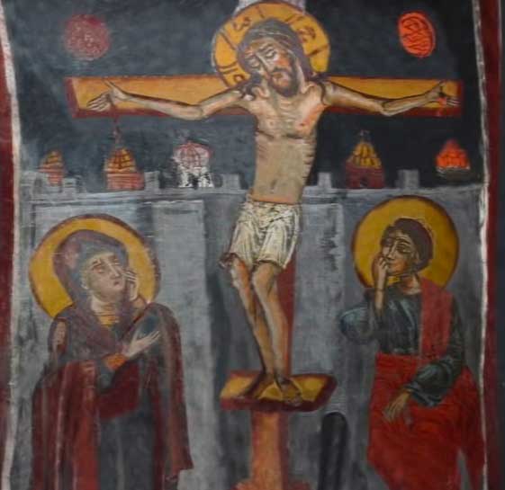 - İsa burada çarmıha gerilirken belden yukarısı çıplak olarak resmedilmiştir. Onunla birlikte iki suçlu daha resmedilmiştir.